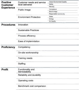 The selection may encompass a singular approach or a combination of the four-domain framework of the balanced scorecard, with the objective of enhancing the facility functionality and serviceability, facility management and service quality, addressing or minimising deviations from design and regulatory requirements, implementing investment-grade improvements, and developing the knowledge base of service providers.
